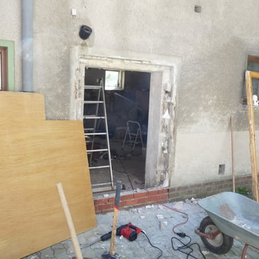 Mittlerweile haben wir auch die alte Stallwand zur Hofseite durchbrochen und eine schöne (gebrauchte) Eingangstür eingebaut. Die alten Stallfenster auf der Südseite wurden alle ausgebaut und gegen größere Holzfenster getauscht. Aussen haben wir einen Edelstahlschornstein angebaut. Der Raum kann also wunderbar mit einem Kaminofen beheizt werden. Mittlerweile haben wir eine Trennwand vorbereitet, die den großen Seminarraum (36qm) vom Eingangsbereich, der Toilette, Dusche und einer kleinen Küchenecke abtrennen soll. Die elektrischen Leitungen wurden ebenfalls komplett erneuert.