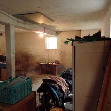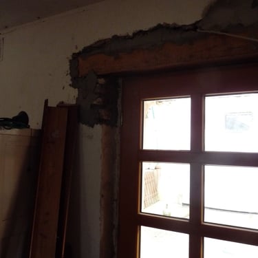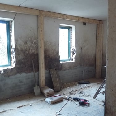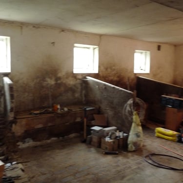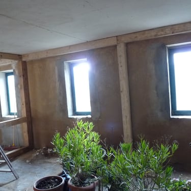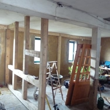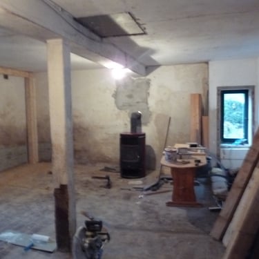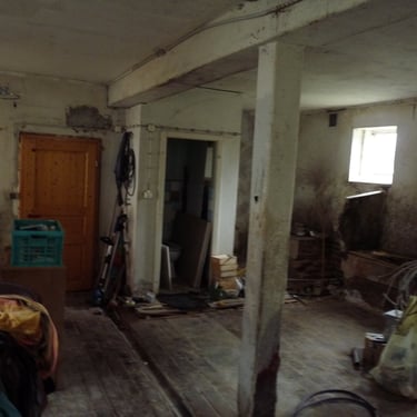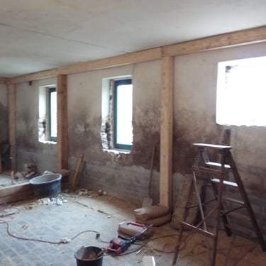 Unser zukünftiger Seminarraum war früher der Kuhstall. Schon die Beräumung war ein Gewaltakt, es musste ein Abluftschacht entfernt werden. Die alte Heizungsanlage des Hauses, samt Tank und Kessel demontiert werden. Die Südwand haben wir aus statischen Gründen mit einem Holz - Unterzug verstärkt.